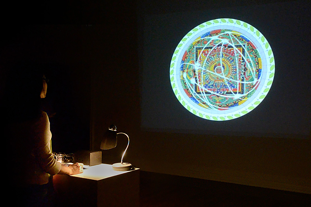 “Living Mandala” is an exploration into uncharted territories of the human soul sculpted by our present time. This interactive revolving graphical system visualizes our perceptions of life (microcosm) and the universe (macrocosm), our connections to ancient mythology, cosmology, and cultural heritage, and the relationships among humankind, science, technology, and nature in a globalized society. Merging rich historical, cultural, and scientific imagery and symbols with real-time data and sound, this living organism alters every moment responding to the movement, light, sound, and temperature of its surroundings. Built with Processing, an open source programming language and environment including real time data and scientific imagery, this project consists of three layers with complex graphics and symbols: 36 ancient mandalas and cosmological circular imagery collected from 16 cultures, 15 graphics representing human studies and perceptions of the world and the universe, and nine nature icons.